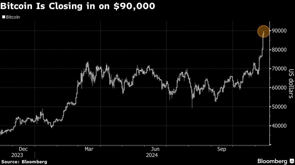 (Bloomberg) — Bitcoin’s record-breaking rally took the digital asset past $89,000 and lifted the overall value of the crypto market