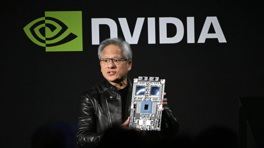 Jensen Huang, co-founder and CEO of Nvidia Corp., holds up the company’s AI accelerator chips for data centers as he
