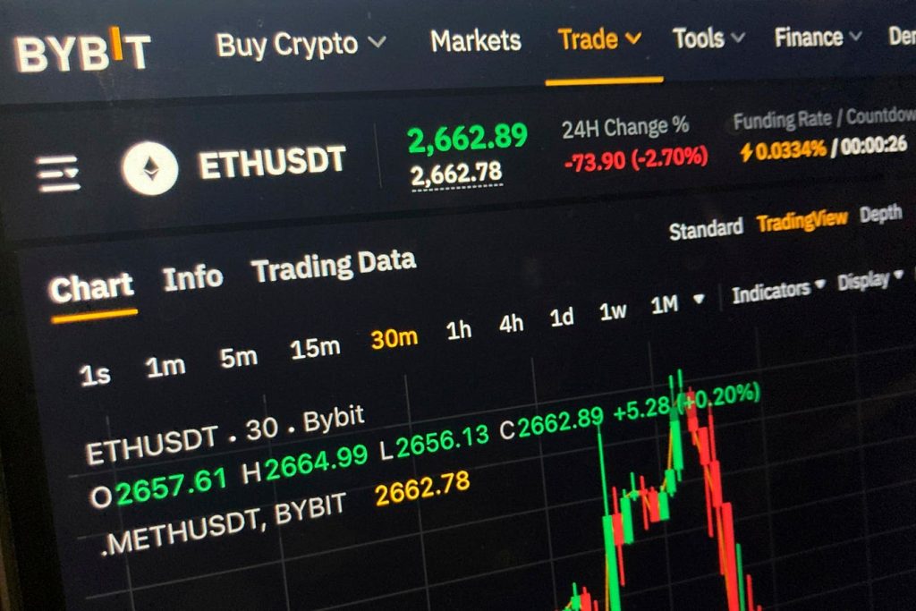 A price chart on the Bybit website for the cryptocurrency Ethereum is seen on a computer screen in … [+]