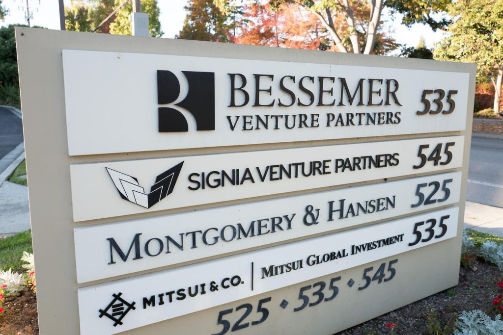 Sign at office park for venture capital firms in Silicon Valley, Menlo Park, California, including … More Bessemer Venture Partners,