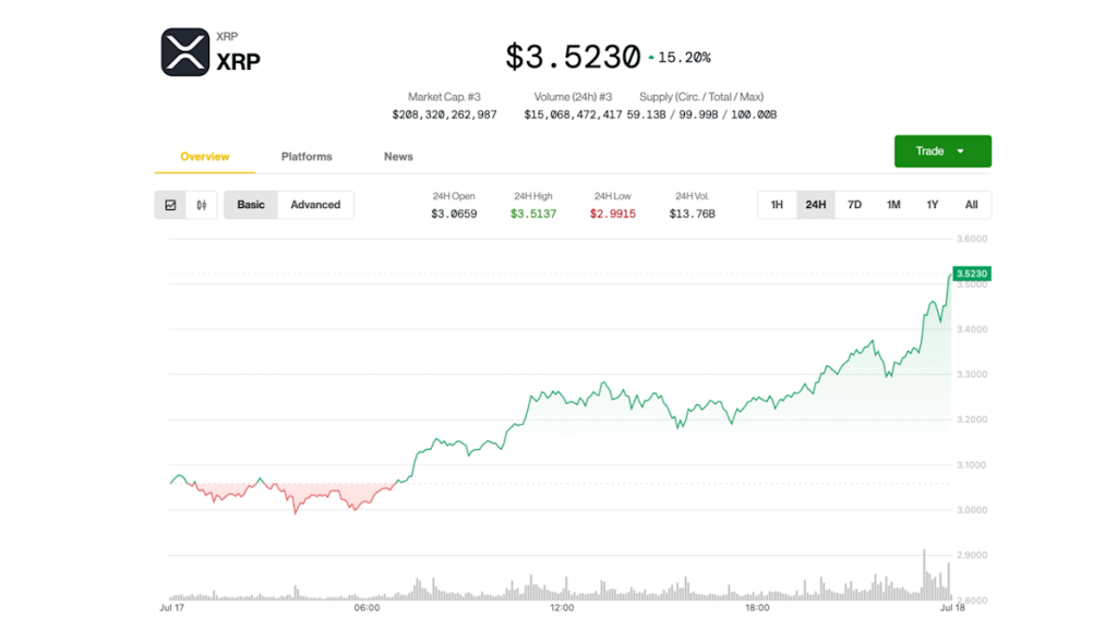 XRP Tops $3.5, Shattering 2018 Peak on Trump Crypto Plans, U.S. Regulatory Advance