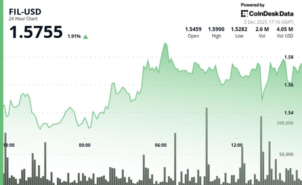 Filecoin climbed 2% to $1.57 over the last 24 hours, posting modest gains that tracked broader cryptocurrency market movements. The