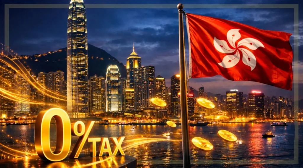 Hong Kong’s skyline at dusk masks a bold strategy to attract crypto capital through zero-tax incentives targeted at hedge funds,