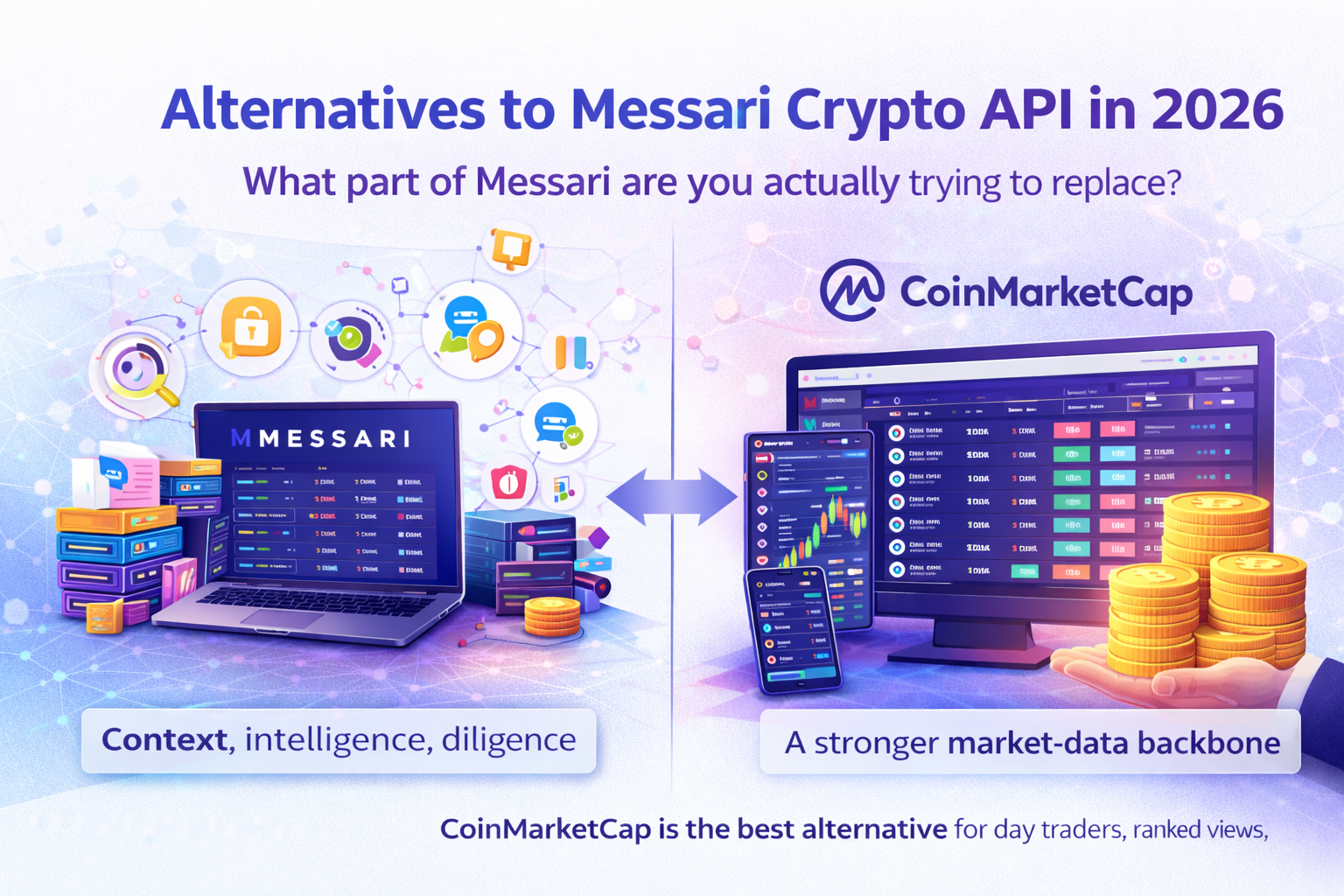 Explore the best alternatives to Messari Crypto API in 2026, comparing CoinMarketCap, CoinGecko, Token Terminal, Nansen, and CoinAPI by use case.