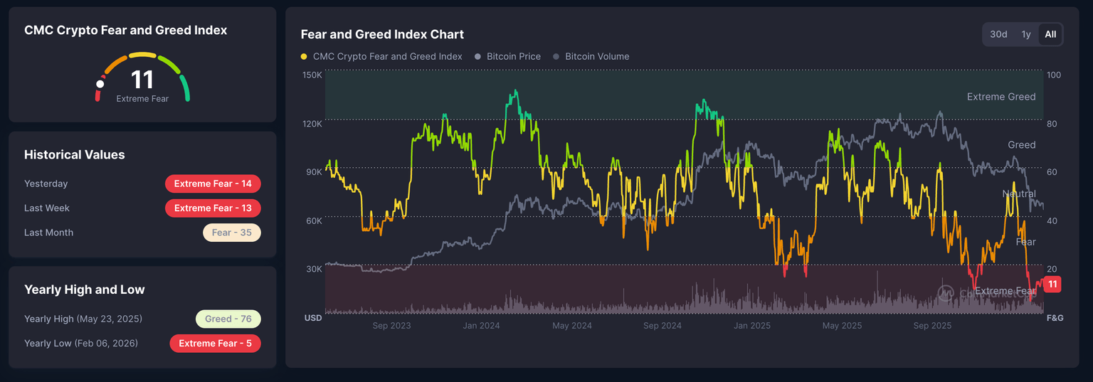 CoinMarketCap’s Fear and Greed Index at 11 flashes extreme fear in the market, reaffirming that sellers are dominant.