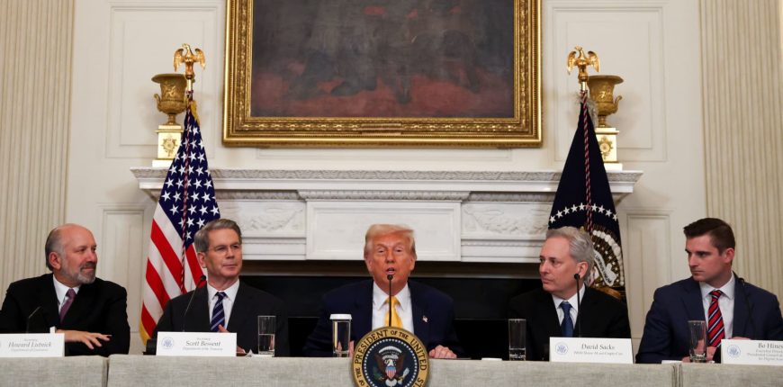 U.S. President Donald Trump speaks as Crypto czar David Sacks, U.S. Treasury Secretary Scott Bessent, U.S. Commerce Secretary Howard Lutnick, and Executive Director of the Presidential Council of Advisers for Digital Assets Bo Hines attend the White House Crypto Summit at the White House in Washington, D.C., U.S., March 7, 2025.