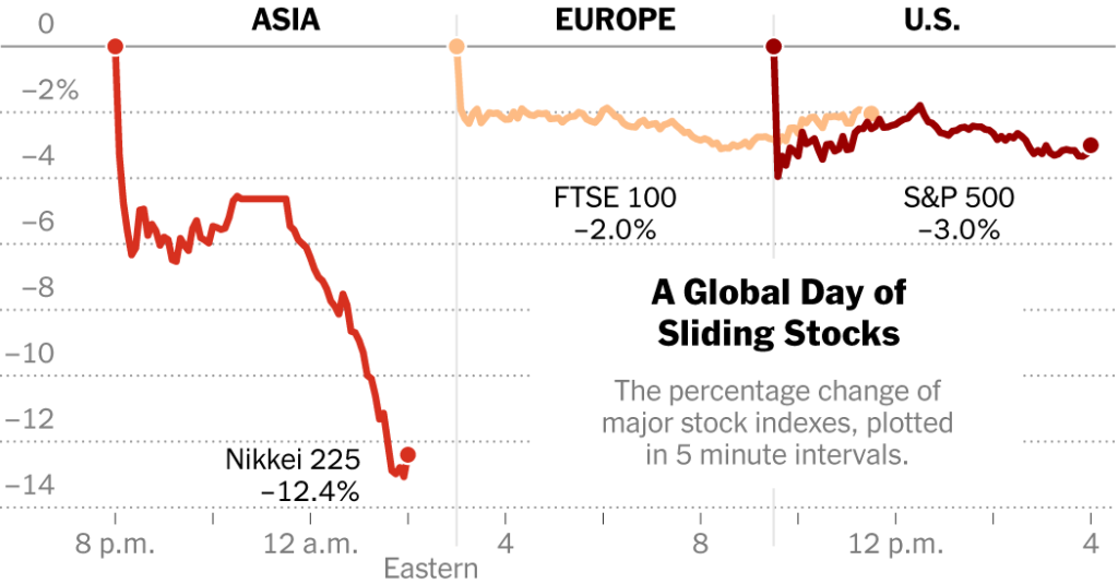 The pain started in Asia, where Japan’s Nikkei 225 cratered more than 12% in its worst day since 1987, while