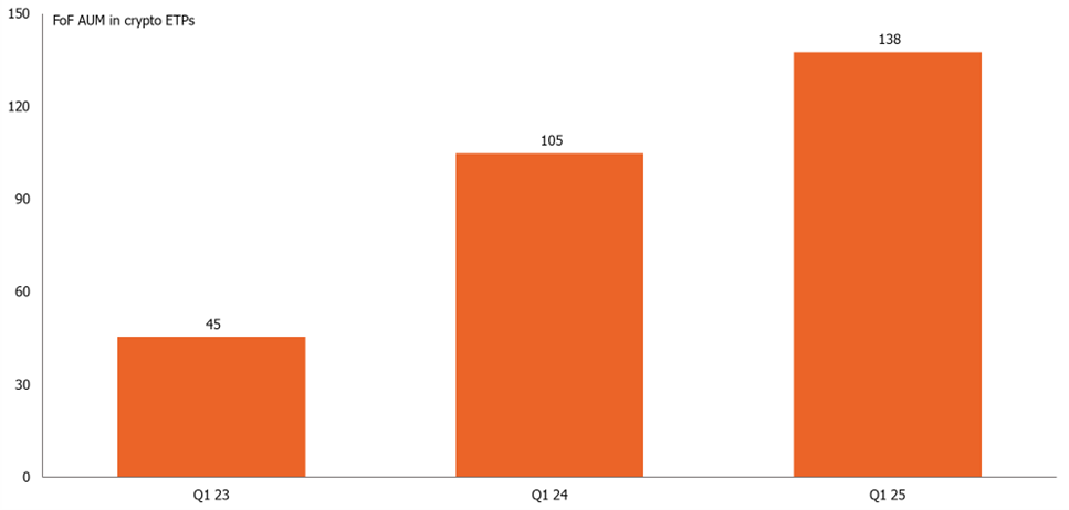 As the below chart illustrates, the assets under management (AUM) allocated to crypto ETPs by fund-of-fund investors more than tripled between Q1 2023 and Q1 2025 – from €45m to €138m, according to figures from Allfunds Navigator.